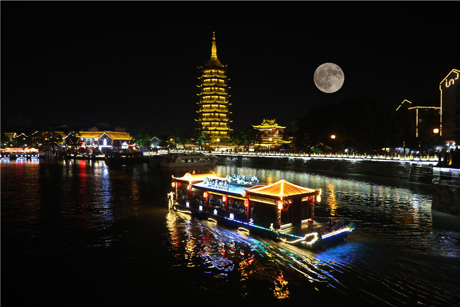 A "super moon" hangs over ancient building complexes at Zhongzhou Island Scenic Park along the Grand Canal in Huai'an, East China's Jiangsu province, on June 14, 2022. [Photo/IC]