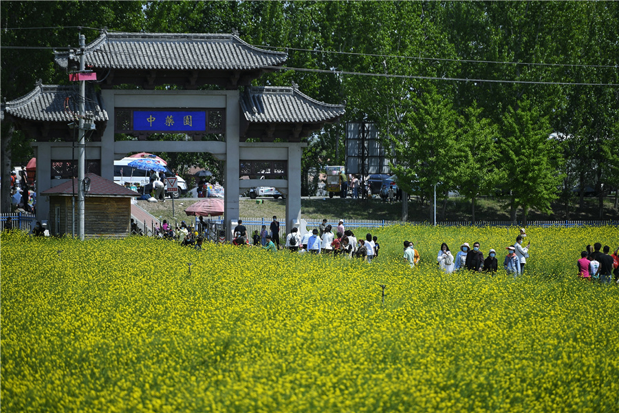 Tourists take photos of isatidis flowers in full bloom at the Chinese Herbal Medicine Garden along the Grand Canal in Tianjin, on May 1, 2022. [Photo/IC]
