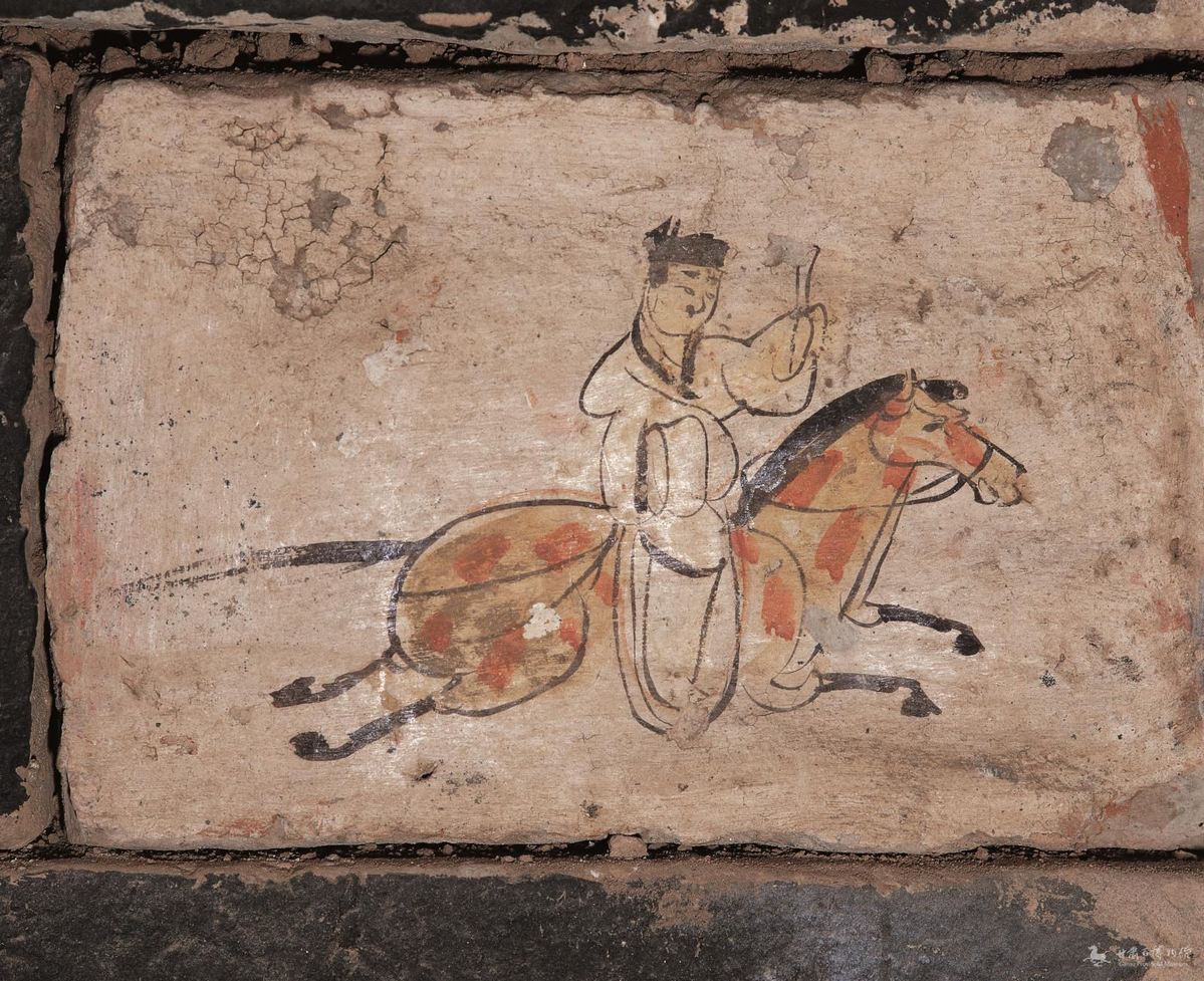 A brick depicts a messenger during the Wei and Jin dynasties (220-420) riding a galloping horse and holding a wooden pass. The messenger has no mouth, indicating the confidentiality of his mission.