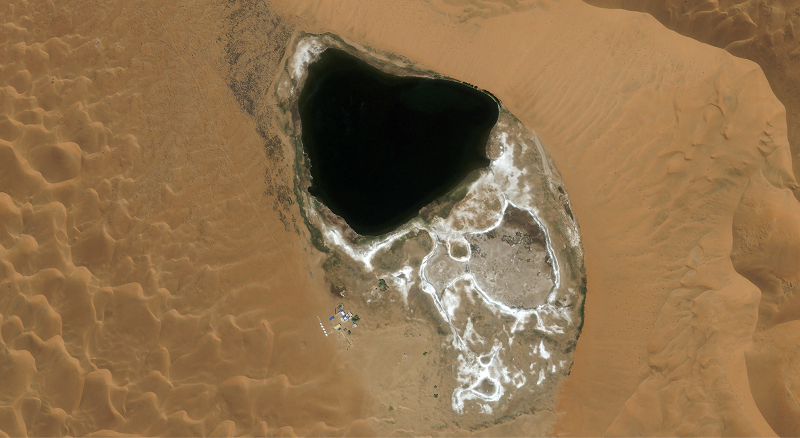 A photo taken by the Jilin-1 satellite shows a lake in the Badain Jaran Desert of Alshaa League of the Inner Mongolia autonomous region. [Photo by Changguang Satellite Technology/For chinadaily.com.cn]