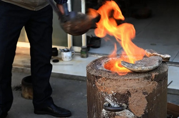 Then he puts some broken copper pieces onto a hot cauldron over the fire. After the copper pieces melt into liquid, he pours the boiling copper liquid to a mold. This results in a rough copper product, and Shen will then make some improvements by hammering, carving, and welding to transform it into a piece of art.