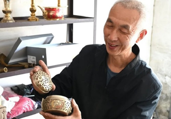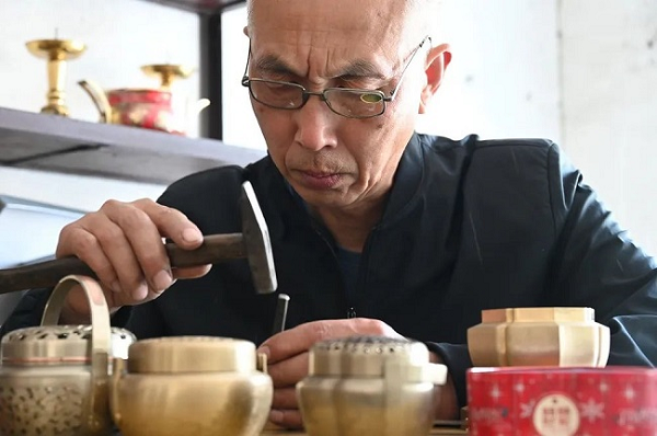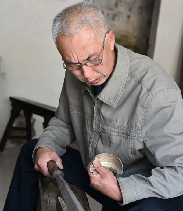 Fifty-five-year-old Shen A'gen comes from a family of coppersmiths and is the family's fifth-generation coppersmith. He started learning the craft when he was 13 years old.