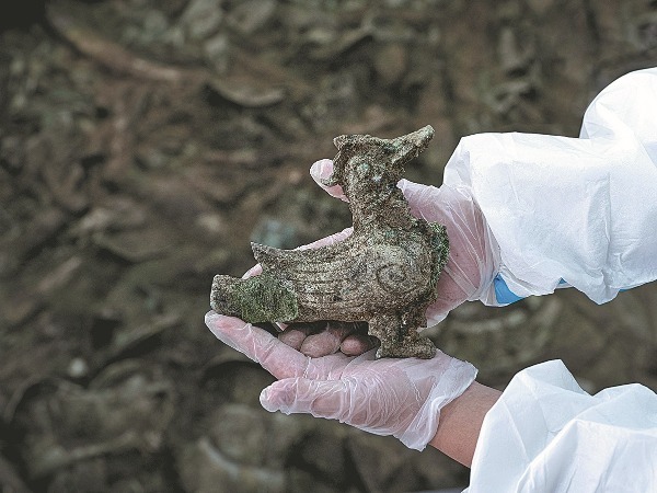 A researcher takes a bronze bird-shaped figurine out of a sacrificial pit on Feb 9. [Photo by Yu Jia/China Daily]