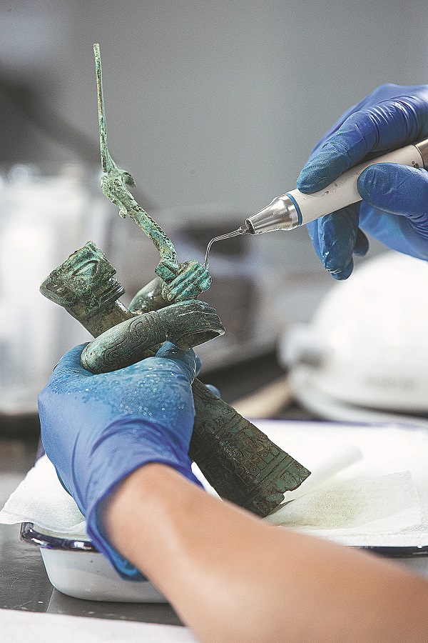 An archaeologist uses a special tool to clean a bronze figurine at the laboratory. [Photo by Yu Jia/China Daily]