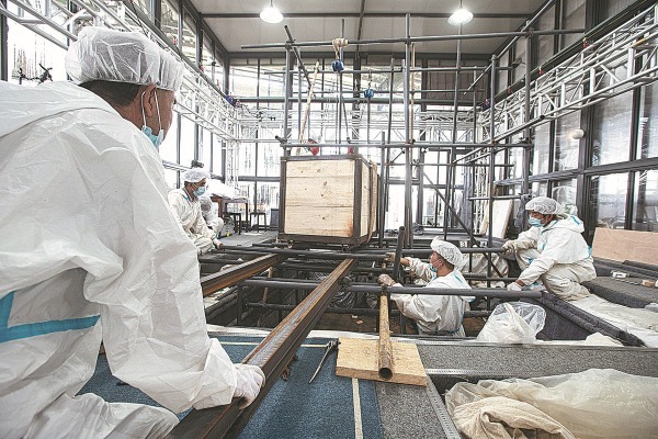 Relics protectors move a wooden case out of the No 6 pit, which holds the new finds. [Photo by Yu Jia/China Daily]