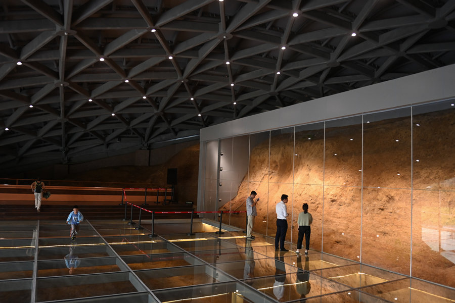 Visitors view the relic at the exhibition hall in Laohuling site of the Archaeological Ruins of Liangzhu City on July 6, 2022. [Photo/Xinhua]