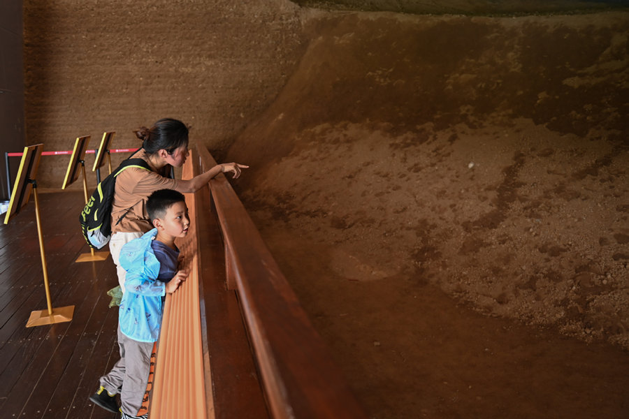 Visitors view the backfill areas with sandbags in Laohuling site of the Archaeological Ruins of Liangzhu City, July 6, 2022. [Photo/Xinhua]