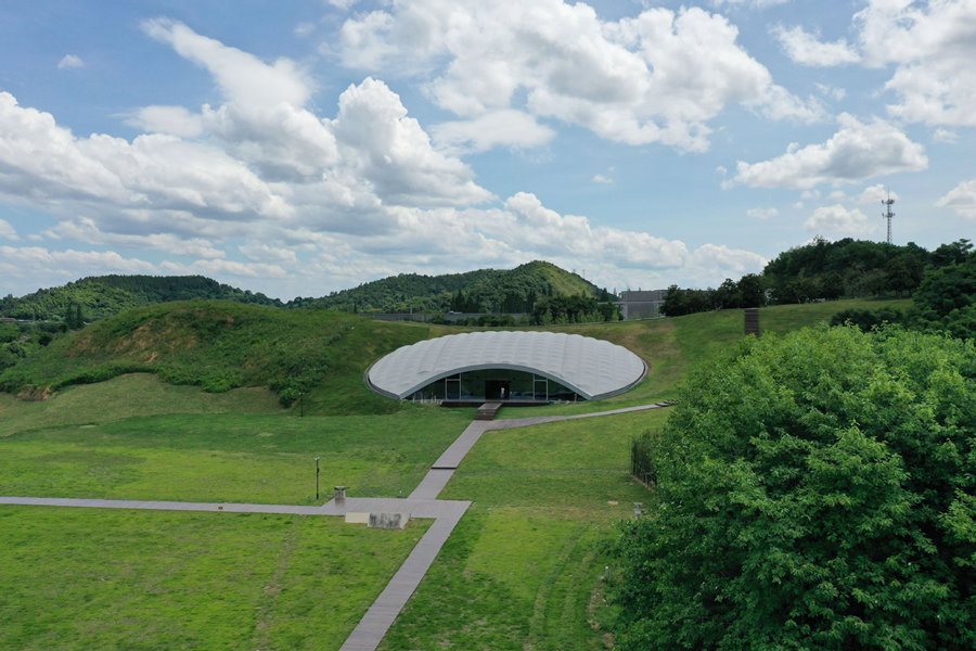 A drone photo of Laohuling site of the Archaeological Ruins of Liangzhu City on July 6, 2022. [Photo/Xinhua]