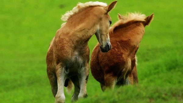Two foals cavort on the grass. [Photo by Jiang Xiwu/Provided to chinadaily.com.cn]