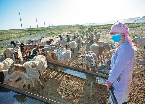 Herdswoman Sonam Drolma watering the sheep in the pasture. [Photo by KUANG LINHUA/China Daily]
