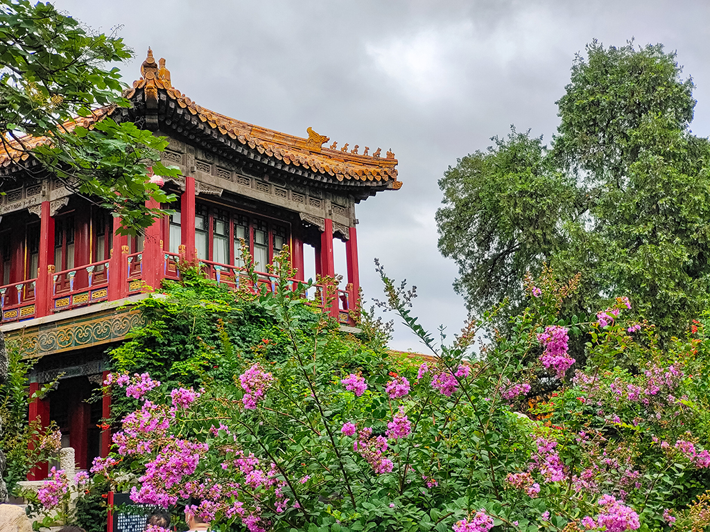 Let’s take a virtual tour of the Imperial Garden (Yu huayuan) of the Forbidden City in Beijing! After a recent rainfall, colorful flowers, including purple crape-myrtles and orange Chinese trumpet vines, are seen blooming around the ancient pavilions. A sight to behold!