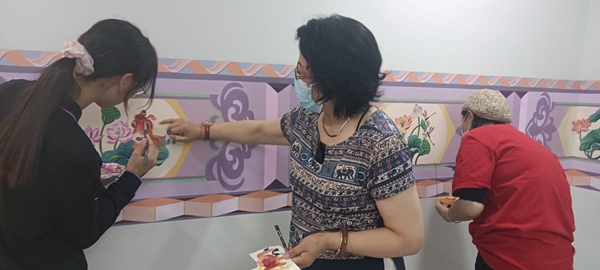Tian teaches a student the finer points of painting a kangweihua piece.[Photo provided to China Daily]