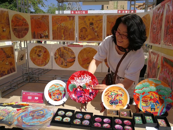 Tian Kun displays ceramic plates decorated by her at the local cultural center of Tongxin county, in Ningxia Hui autonomous region.[Photo provided to China Daily]