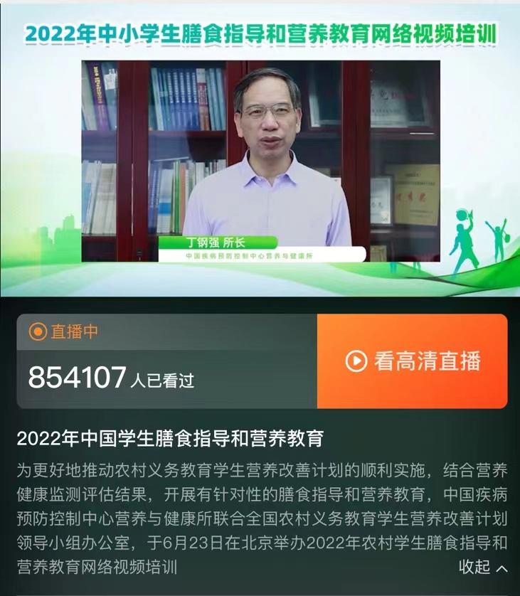 Co-organized by the National Institute for Nutrition and Health (NINH) of the China CDC and the office of the leading group of Nutrition Improvement Program for Rural Students in Compulsory Education, a training course on dietary guidance and nutrition education for primary and secondary school students was held online on June 23, 2022.