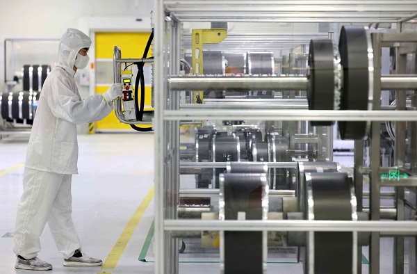 A technician works at a production line in a power battery firm in Hefei, Anhui province on July 17. In recent years, the city has continued to lift its power battery production capacity to meet the demand from new energy vehicles. Local authorities have beefed up technology investment and policy support for the new energy industry and perfected industrial layout to improve stability and competitiveness of the supply chain. [Photo/Xinhua]