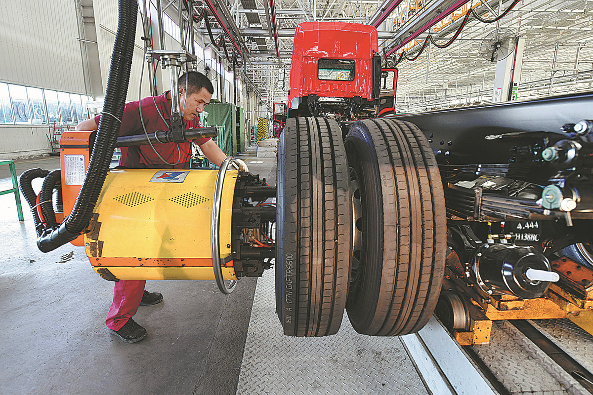 A worker assembles a truck on Friday at a workshop of Anhui Jianghuai Automobile Group Co in Fuyang, Anhui province. [Photo by LU QIJIAN/FOR CHINA DAILY]