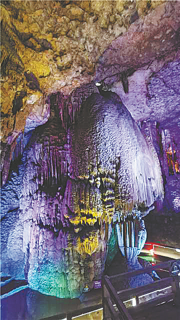 Water has poured down along fractures in the rock wall over centuries and calcium carbonate in the water has continuously precipitated, resulting in the layer-shaped accumulations nicknamed Stone Curtain.