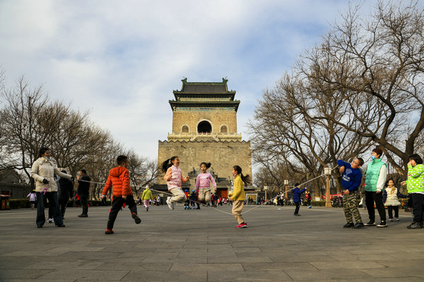 Children play in front of the Drum Tower. [Photo by Zhu Yunxia/For China Daily]