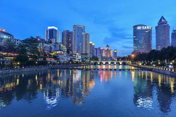 An impressive river view of Guiyang's business area at night. [Photo/VCG]