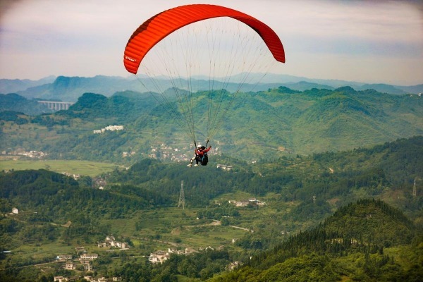 On a sunny June day, the Yunzhongjun Paraglider Base in Kaiyang county of Guiyang, Guizhou province, attracted a group of tourists who wanted to experience paragliding.