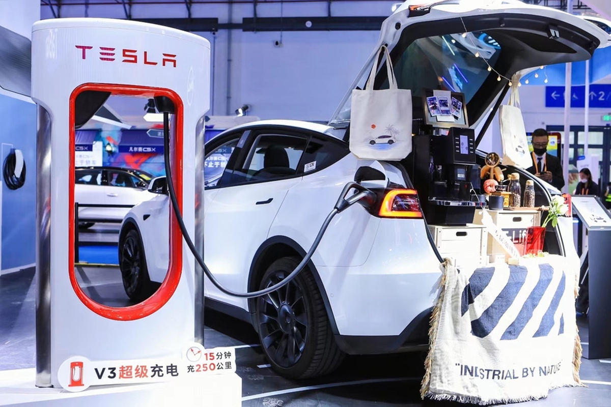 Tesla's 200-square meter booth is a highlight of the expo that kicked off on Monday, offering visitors opportunities to learn about the latest developments about smart electric vehicles.