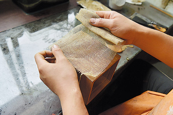 Pingyao's lacquer art is known for its jade-like luster that comes from repeated hand-polishing. When the wood is manufactured into furniture, folding screens and tableware, it is first wrapped in linen and covered with a mixture of parget and pork blood for anticorrosion effects. It is then polished with sandpaper and covered with the mixture again. The process is repeated several times to create a surface smooth enough for later procedures.