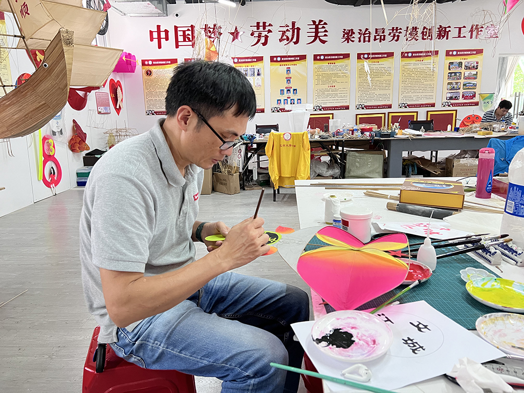 Forty-nine-year-old Liang Zhi’ang is an inheritor of Yangjiang kite making, which is listed as a Guangdong provincial intangible cultural heritage item. Starting to make kites at the age of 5, Liang has kept innovating with his partners on the craft. He created a 68-meter-long, computer-programmed, LED-lighted dragon kite that spouts electronic fireworks.