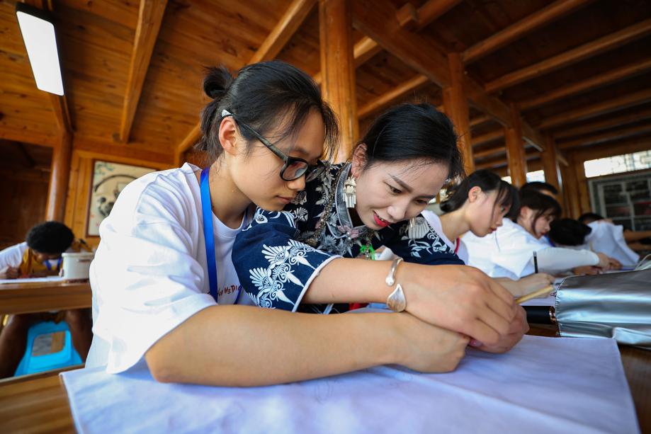 An inheritor of batik teaches foreign students how to draw patterns with wax and blue dye. [Photo by Huang Xiaohai/Provided to chinadaily.com.cn]