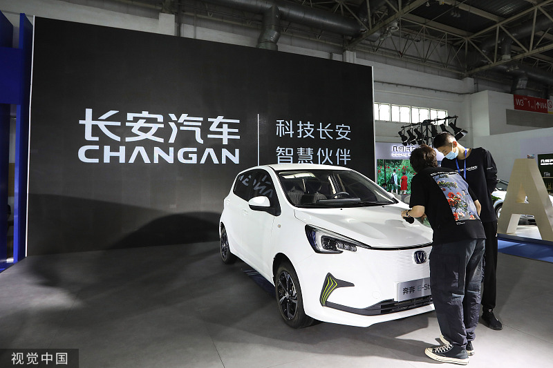 People look at a new energy vehicle at the World Intelligent Connected Vehicles Conference in Beijing on Sept 25, 2021. [Photo/VCG]