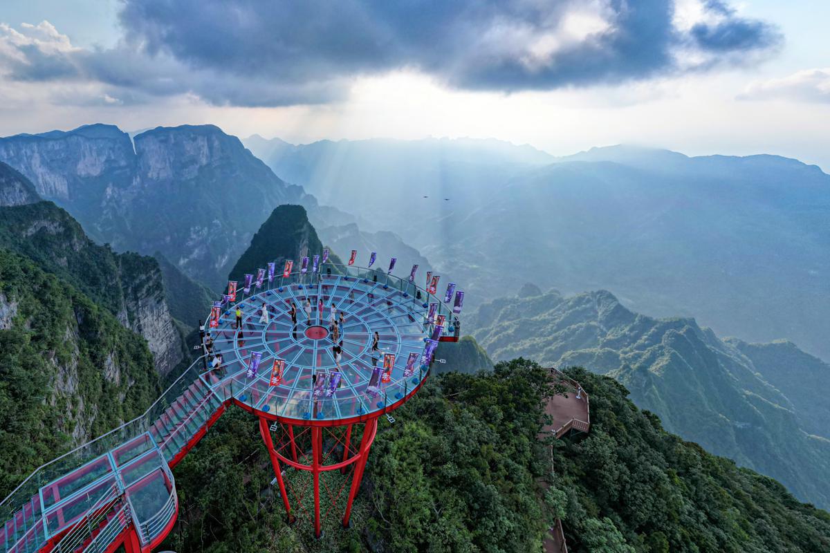 Qixing Mountain has irregular cliffs on four sides. There is a glass sightseeing platform on top, where tourists may feel like they are standing in the clouds while looking down on the valley below.