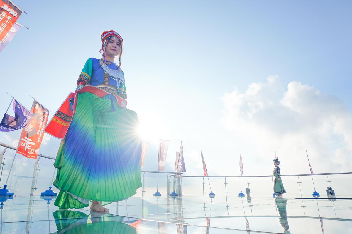 Contestants take part in a fashion show on a sightseeing platform 1,520 meters above ground during the World Tourism Image Ambassador Contest at a special competition area in Zhangjiajie, Hunan province, on July 30. [Photo by Xiang Tao/for chinadaily.com.cn]