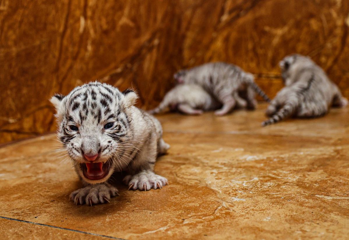 Cute, ferocious or both? Four tiger cubs greet the world from a wildlife park in Rongcheng, East China's Shandong province. The playful quartet is comprised of four white Bengal tigers.