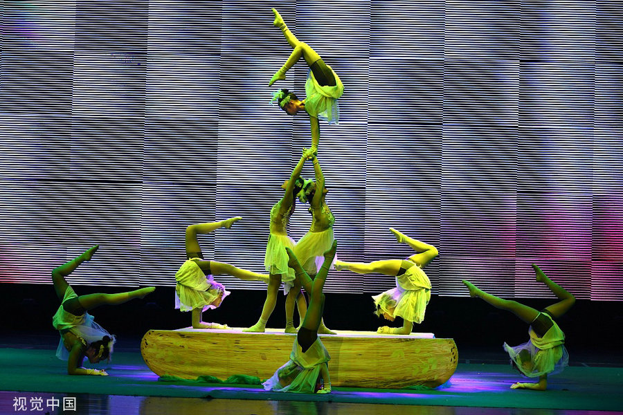 Acrobats perform at the Culture Center of Jianhu county in Yancheng, Jiangsu province, on July 31, 2022. [Photo/VCG]