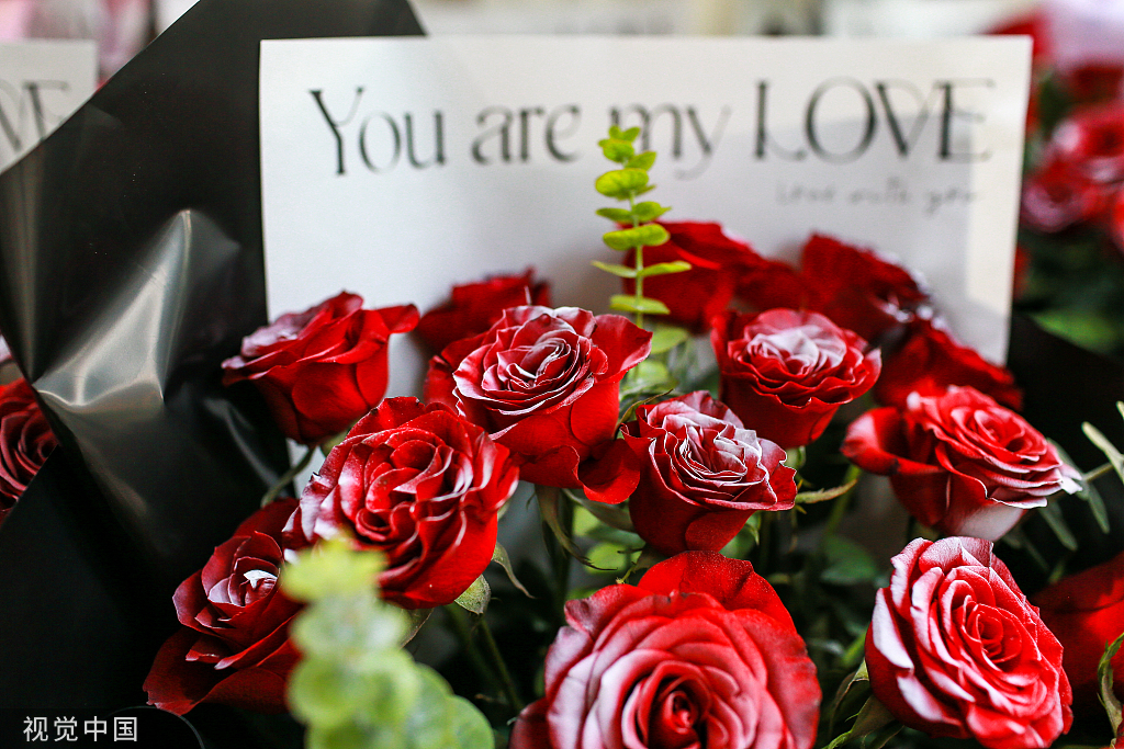 Flowers are still a popular gift for couples, with their sales volume surging 200 percent year-on-year via the online shopping platform Pingduoduo.