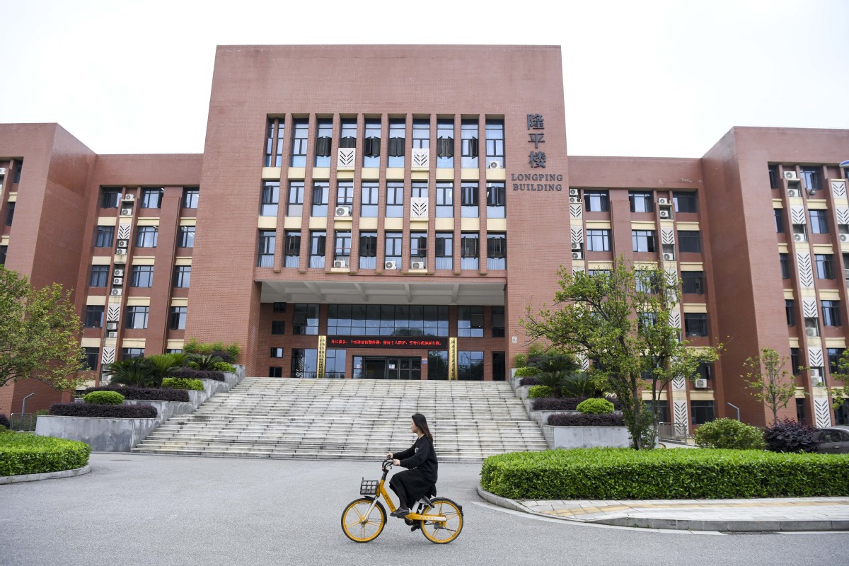 A student rides a bicycle in front of the No 12 classroom building of Hunan Agricultural University in Changsha, Central China's Hunan province, on May 20, 2022. The building was named Longping Building in memory of Chinese agri-scientist Yuan Longping. [Photo/IC]