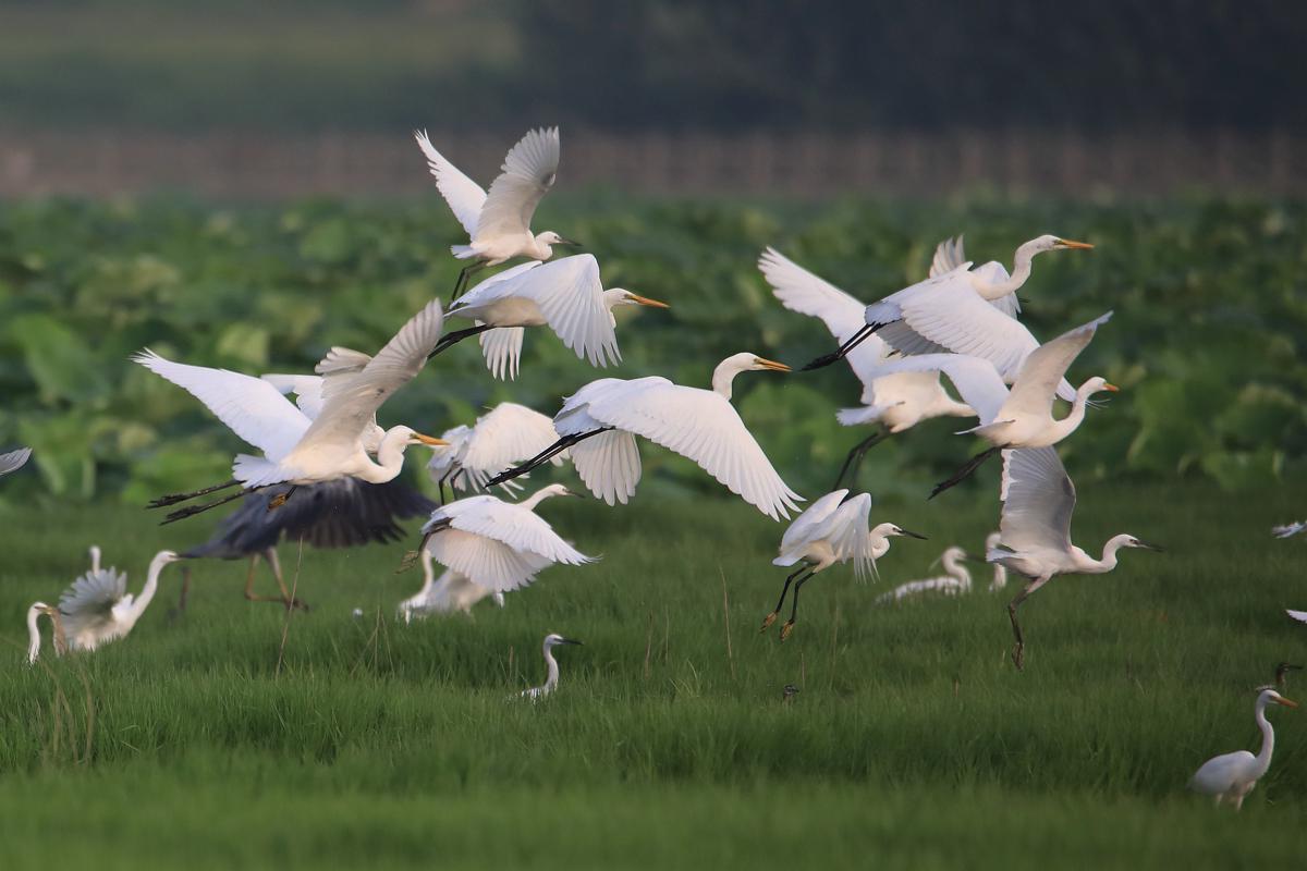 Thousands of egrets have gathered at the Yellow River Wetland Park in Pinglu county, Shanxi province since the beginning of this summer, delighting tourists.