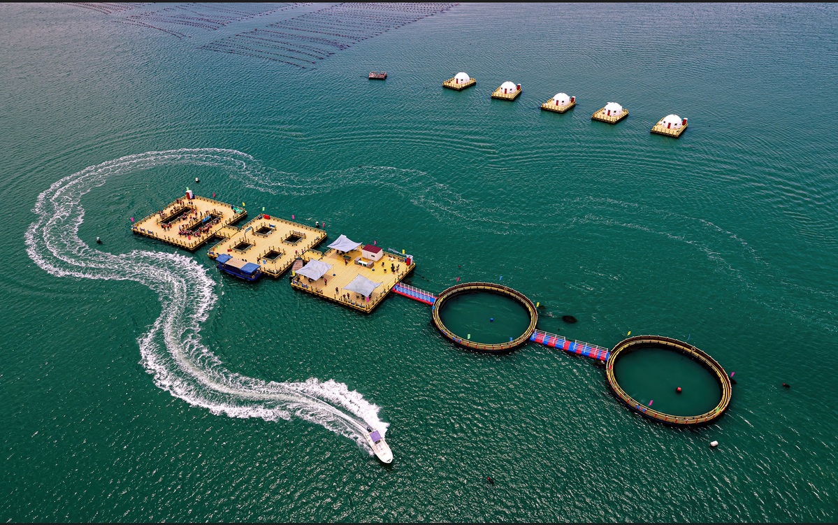 An aerial photo shows a marine ranch in Weihai, Shandong province, that tourists can reach via the tourist highway. [Photo provided to chinadaily.com.cn]