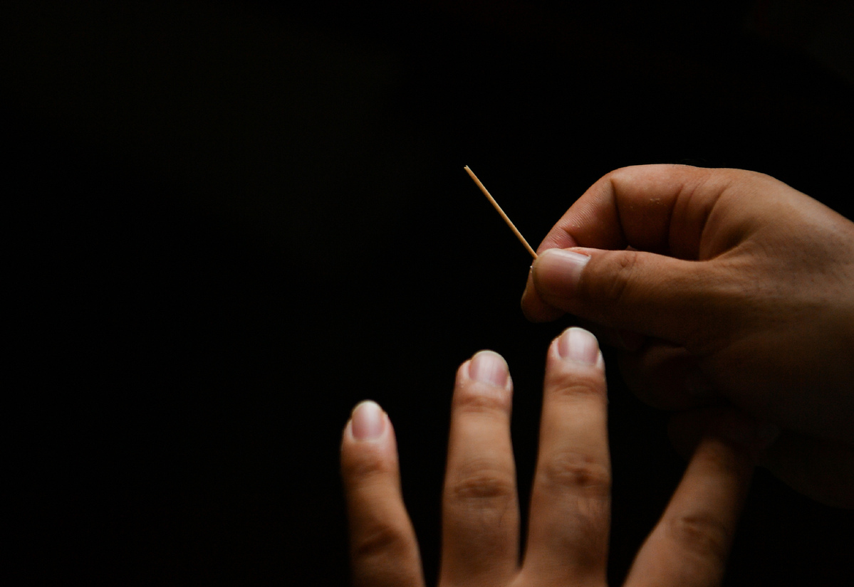 An archeologist shows a needle made of bone excavated from the Shimao ruins, an important prehistoric site in Shenmu city, Northwest China's Shaanxi province, Aug 6, 2022. [Photo/Xinhua]