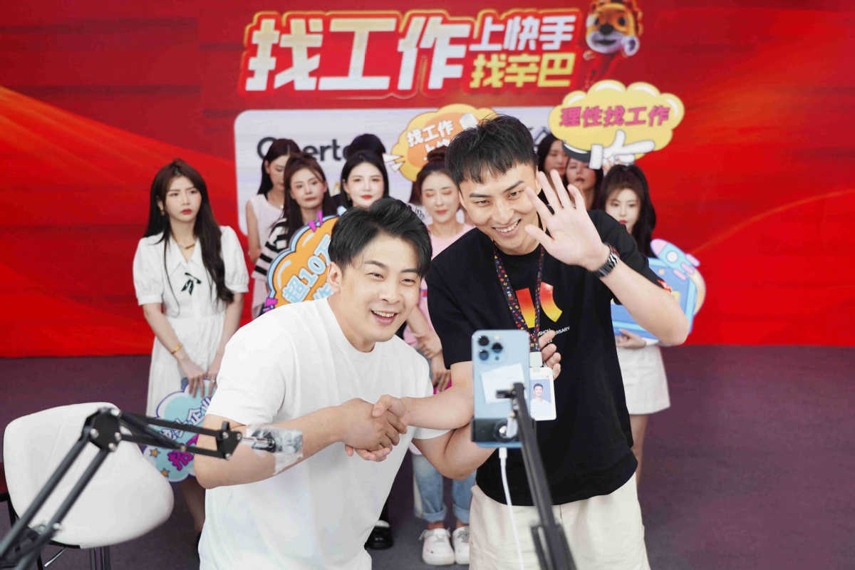Livestream host Xin Youzhi (front) broadcasts job opportunities with his team. CHINA DAILY