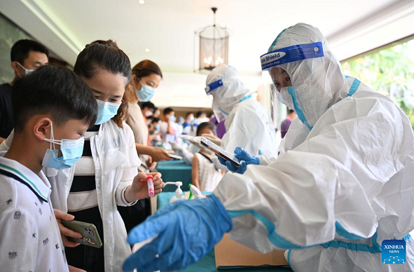 Zhang Wei (first right), a tourist-turned volunteer from Jincheng in North China's Shanxi province, registers nucleic acid test information at a hotel in Sanya, South China's Hainan province, Aug 9, 2022. [Photo/Xinhua]
