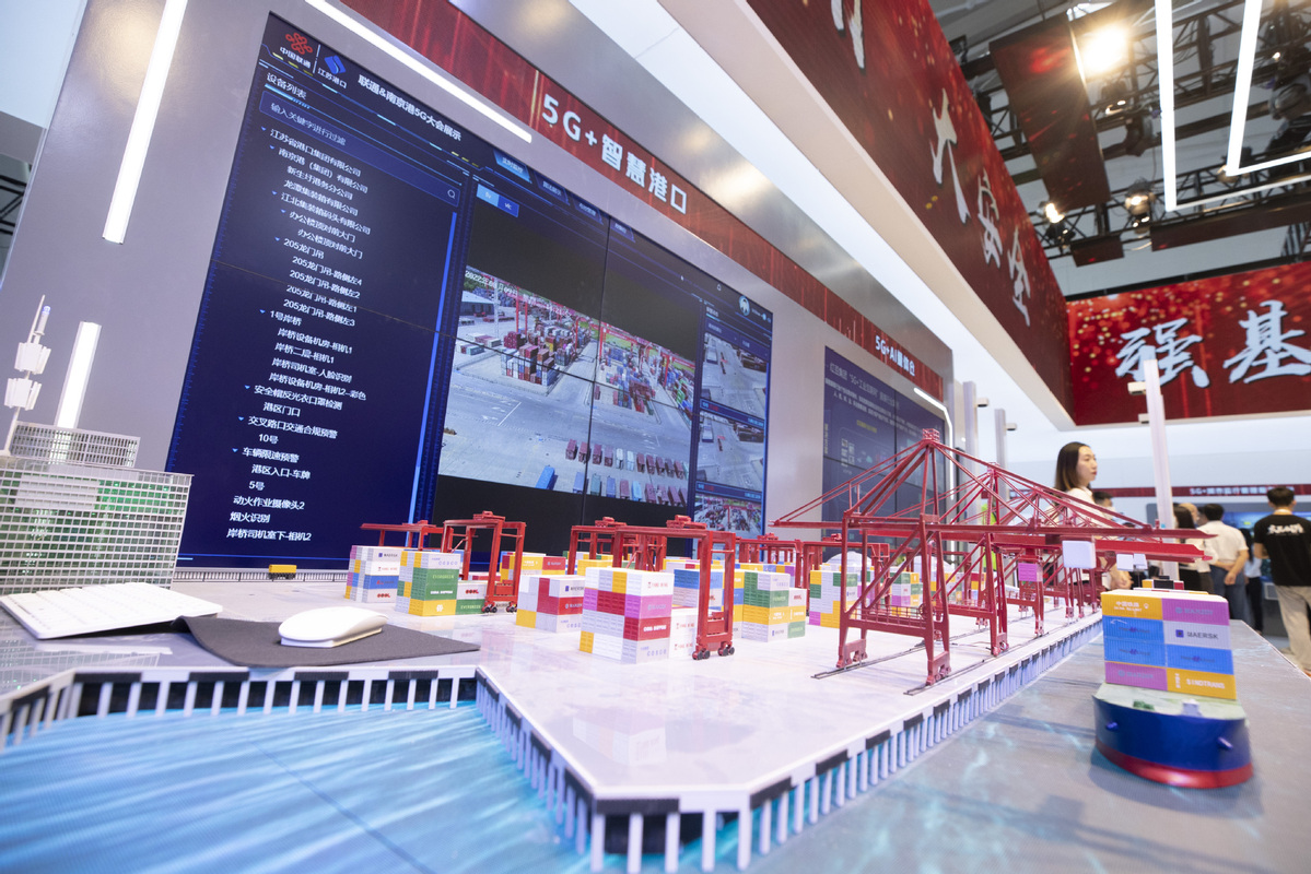 Photo taken on Aug 9, 2022, shows an exhibition area for 5G+ smart port during a media preview at the 2022 World 5G Convention in Harbin, capital of Heilongjiang province. [Photo/Xinhua]