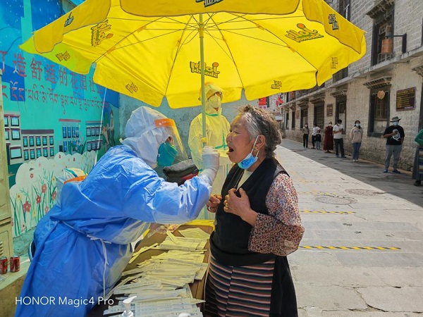 People line up to receive a COVID-19 test in Lhasa, Tibet autonomous region, on Saturday morning. [Photo by Daqiong/For chinadaily.com.cn]