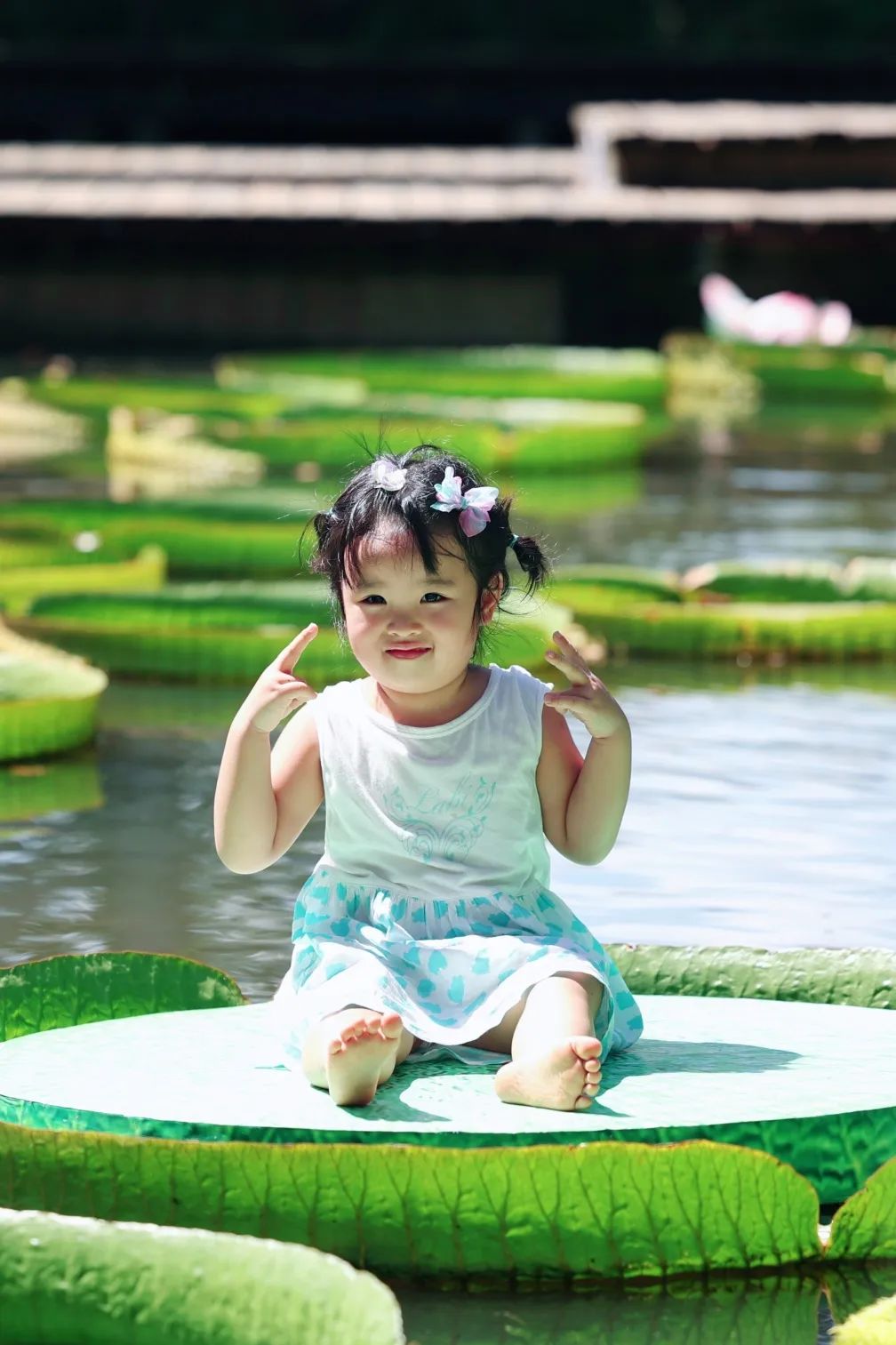 Children have fun seated on royal water lily leaves in Wuhan Botanical Garden