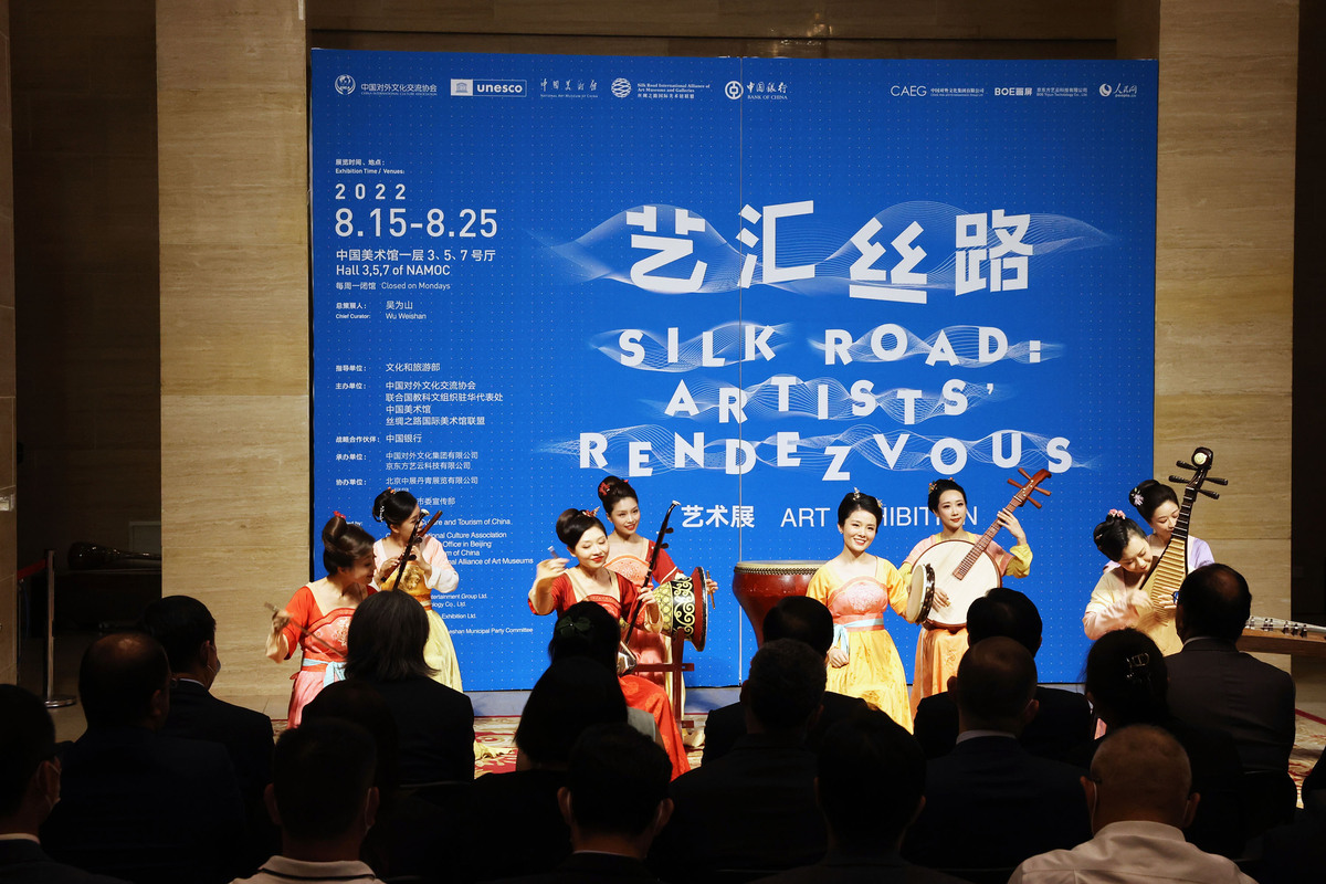 With exotic Silk-Road themed music performed by musicians from the China National Traditional Orchestra, a grand art exhibition titled Silk Road: Artists' Rendezvous kicked off on the afternoon of Aug 15 at the National Art Museum of China in downtown Beijing.