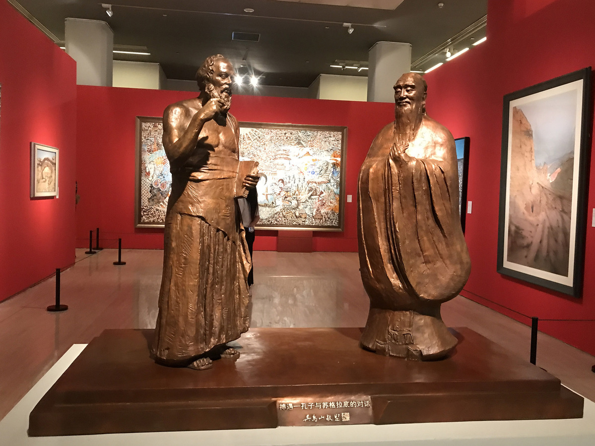 Socrates and Confucius: An Encounter, a copper sculpture by Wu Weishan, dean of the National Art Museum of China, is one of the specially invited works at the Silk Road themed exhibition. [Photo by Zhu Linyong/chinadaily.com.cn]