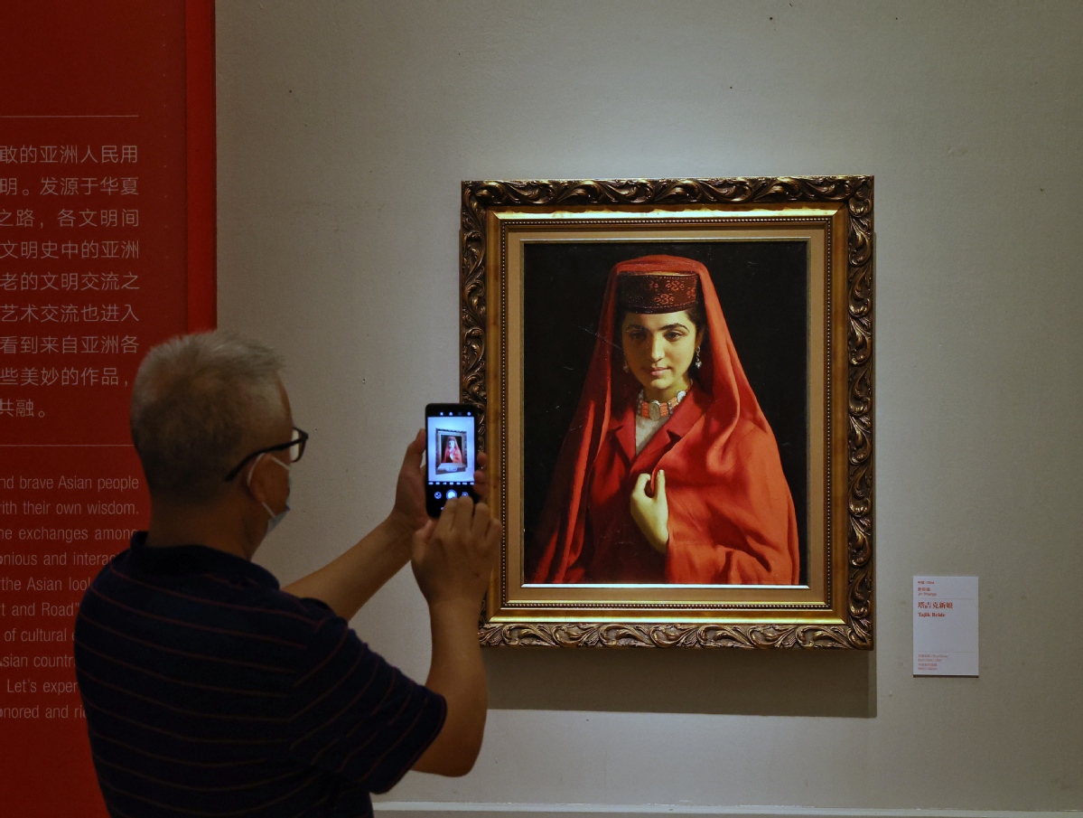 An attendee takes a picture of an art piece at the Silk Road themed exhibition on Aug 15 at the National Art Museum of China in Beijing. [Photo by Jiang Dong/China Daily]
