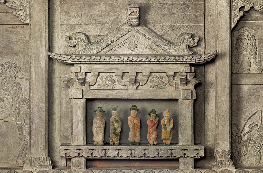 The relief carving of a theatrical stage discovered in the tomb of Dong Ming, dating back to the Jin Dynasty (1115-1234), features five figurines playing different Chinese opera roles.