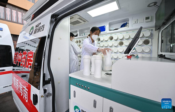 A pharmacist puts a bottle containing concentrated herbal granules into a machine to dispense traditional Chinese medicine (TCM) at a "mobile TCM pharmacy" in Sanya, South China's Hainan province, Aug 20, 2022. Following the latest COVID-19 resurgence, twelve makeshift hospitals and three designated hospitals in Hainan province have used TCM to fight the virus. More than 10,000 doses of TCM decoction are delivered to patients from the hospitals every day. [Photo/Xinhua]