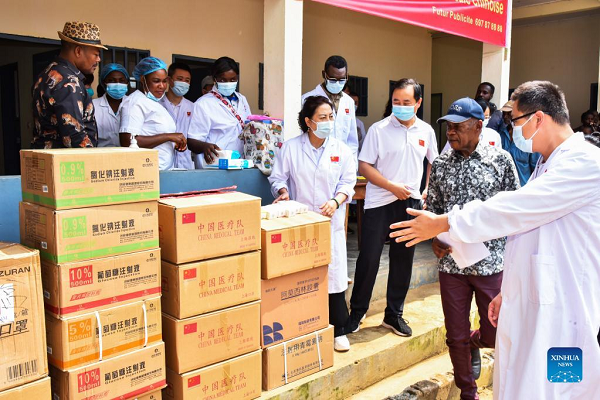 Members of the Chinese medical team present a batch of medicine offered to the Health Center of Ngat-Bane to Dieudonne Zang Mba Obele (2nd R), mayor of Mbalmayo in Ngat-Bane, Cameroon, Aug. 20, 2022. A Chinese medical team in Cameroon on Saturday provided free medical services to the people of Ngat-Bane, a village in the Centre region where the capital, Yaounde is located. [Photo by Kepseu/Xinhua]