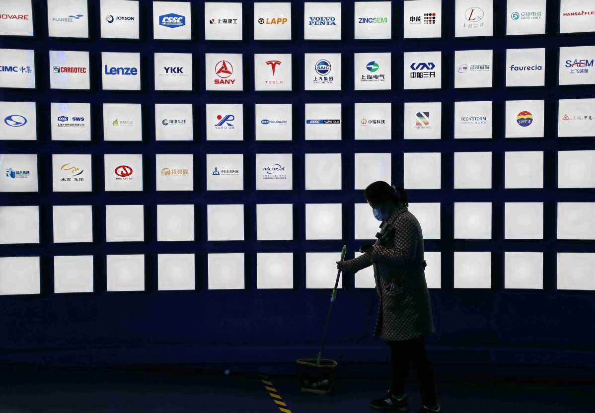 A woman walks past a wall showcasing companies settled in Lin-gang. YU JIE/FOR CHINA DAILY
